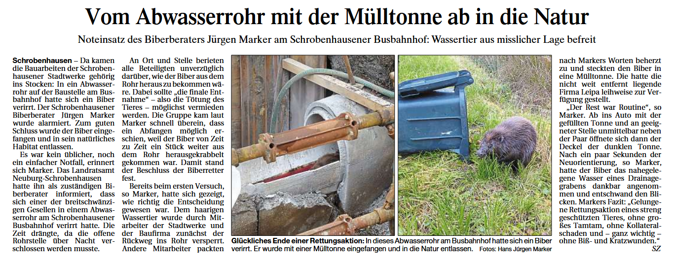 Zu einem unerwarteten Baustopp kam es kürzlich beim Ringschluss des Schrobenhausener Fernwärmenetzes. Ein Biber hatte sich in ein Abwasserrohr auf der Baustelle am Busbahnhof verirrt. Der Schrobenhausener Biberberater Jürgen Marker wurde zu Rate gezogen und das breitschwänzige Tier konnte schnell eingefangen und nahe der Paar wieder freigelassen werden.